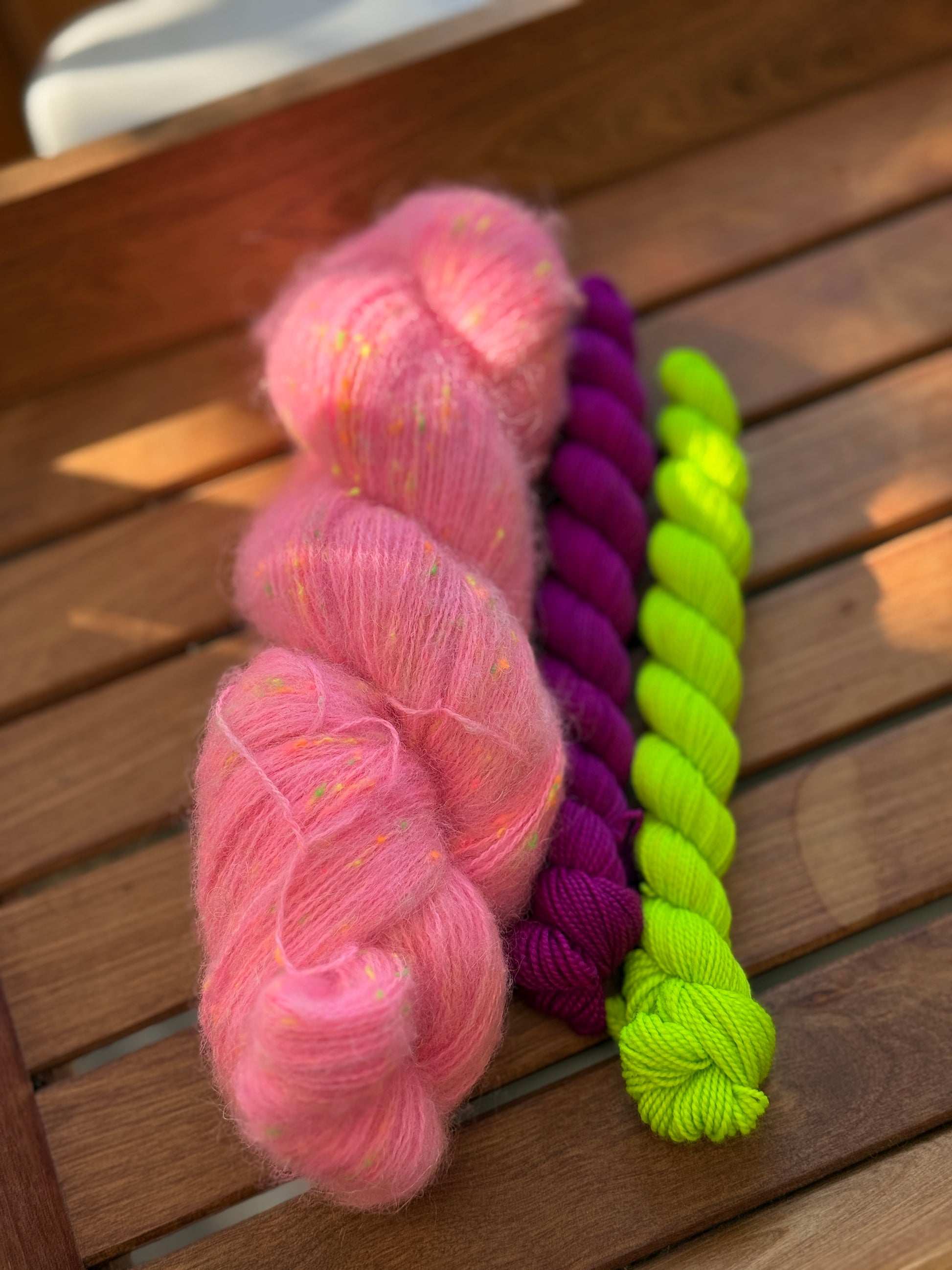 It’s soft with a gentle alpaca halo, the linen gives it a little texture, and the neon neps pop through the dye like tiny sparks of colour